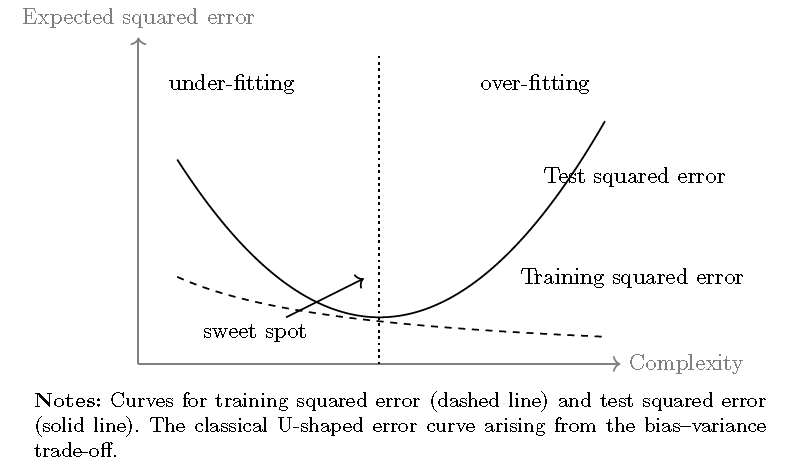 Thus, the ESE is composed of the squared bias, the variance of the prediction (which is a random variable due to data variation \(\mathcal{D}\)), and the irreducible error. The key insight is that increasing model complexity, such as by including more inputs, typically reduces bias but increases variance. This trade-off can lead to overfitting, where models perform well on the training data but poorly on new, unseen data. There is, therefore, an optimal point at which the predictive error is minimized (see the next Figure).70